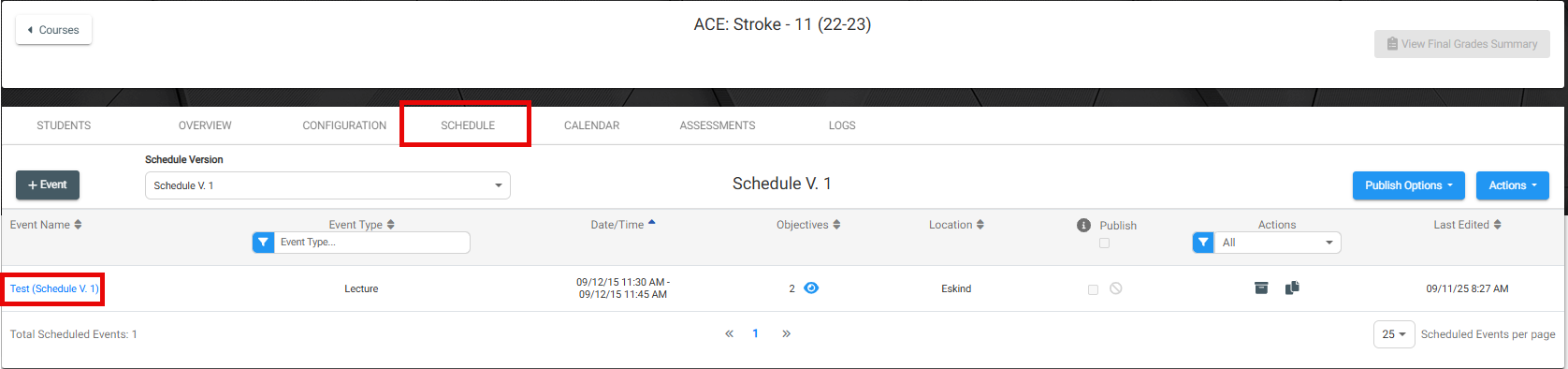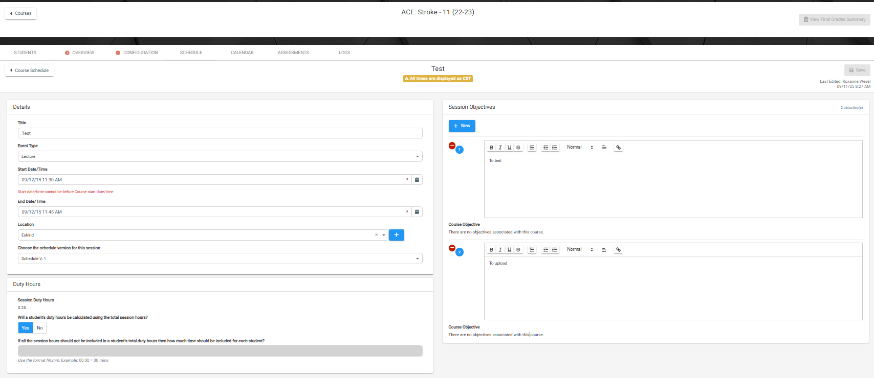 You can edit any schedule by clicking into the course link and navigating to Schedule and clicking into the Event Name to edit any sessions.
