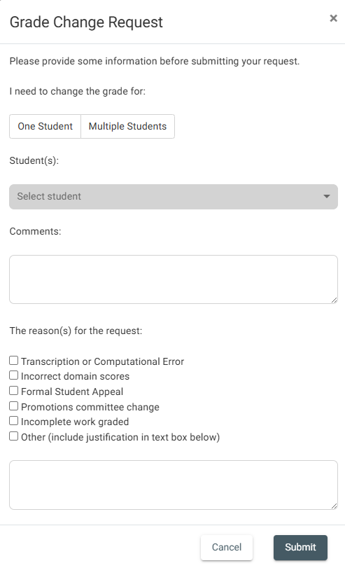 Once a Primary Course Director selects “Request Grade Changes” a new modal will appear to provide additional information for the Grade Change. You will have to specify whether you are submitting the grade change for One student or multiple. After doing this you will be able to select the student(s) name.