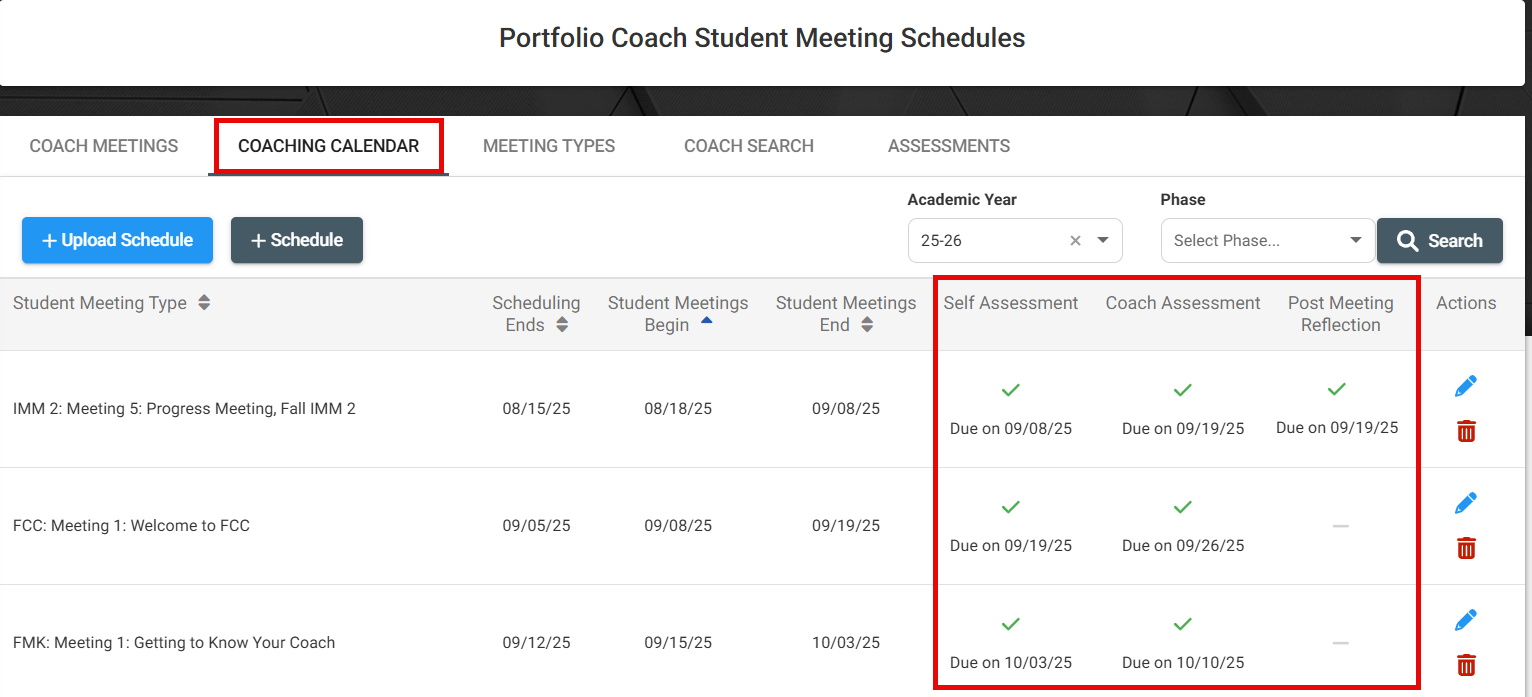 VSTAR Next is the new home of the Portfolio Coach Assessment process, giving administrators the ability to schedule Self & Coach assessments and publishing a table of completed and in-progress feedback.