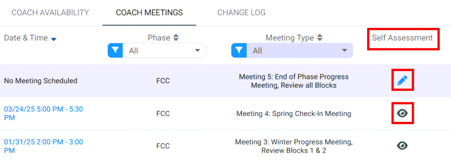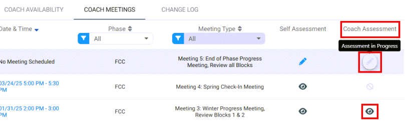 In the Coach Assessment column you can also see if your coach has a pending assessment to fill out for you, which will be displayed with a greyed out pencil icon. If you hover over it, it will tell you that the assessment is in progress and when it was requested. Once your coach has completed the Coach Assessment, you will be able to view it by clicking on the Grey eye icon.